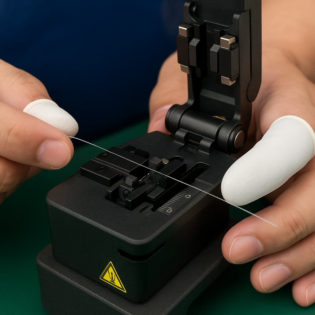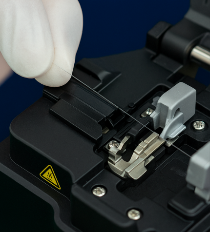 Đặt sợi vào khay cắt chuyên dụng: kích thước khay phải tương ứng với loại cáp (cladding, coating) để đảm bảo độ chính xác.