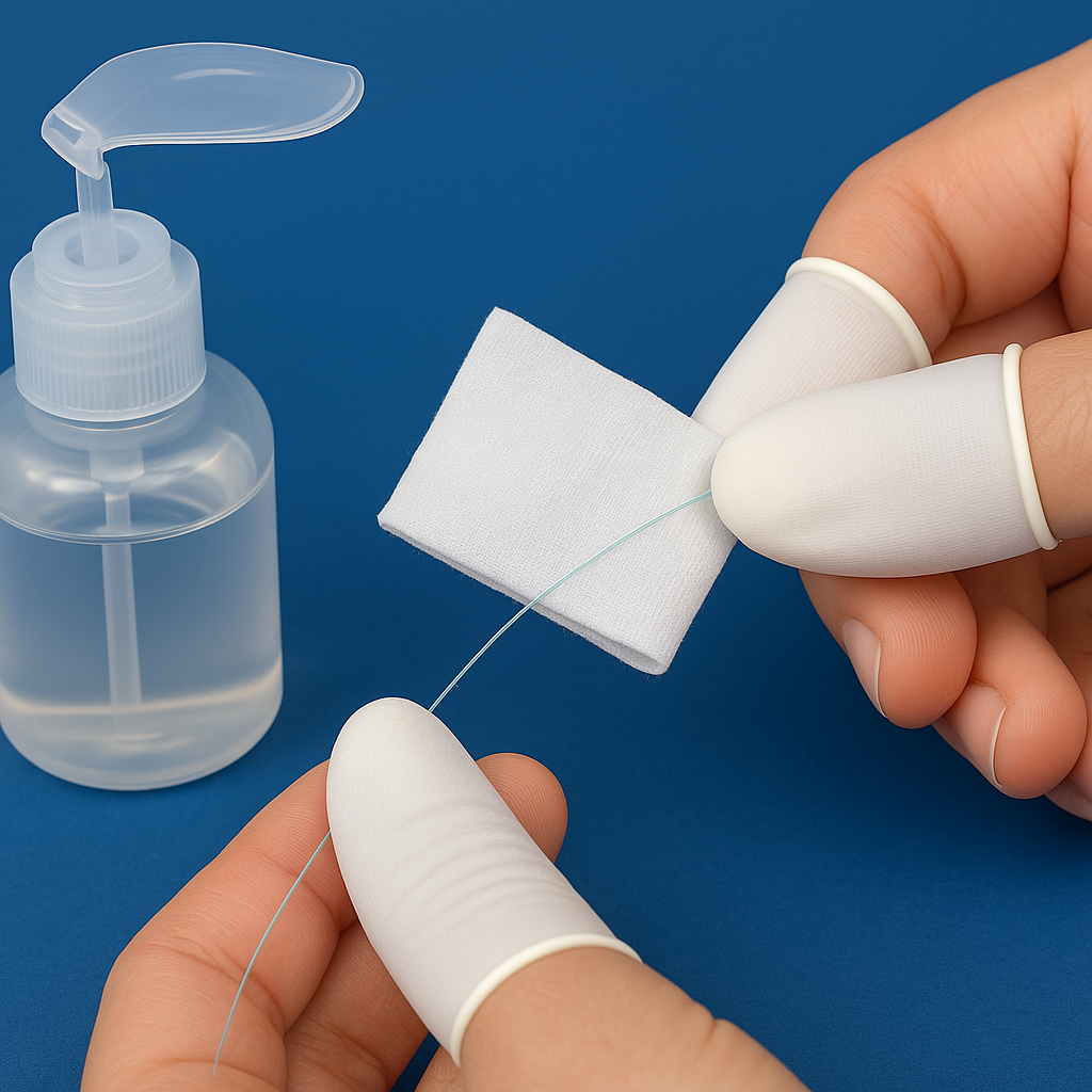 Trước tiên, đầu sợi quang phải được làm sạch tuyệt đối. Nên chuẩn bị đầy đủ găng tay, giấy lau và cồn (aceton nếu có). Khi vệ sinh, bạn nên chú ý lau theo 1 chiều, không được chà qua chà lại (lau cách khoảng đầu sợi quang 15- 20cm). Nếu còn bụi, ẩm hoặc vết bẩn, quá trình cắt sẽ không đạt chuẩn và dễ gây suy hao tín hiệu.